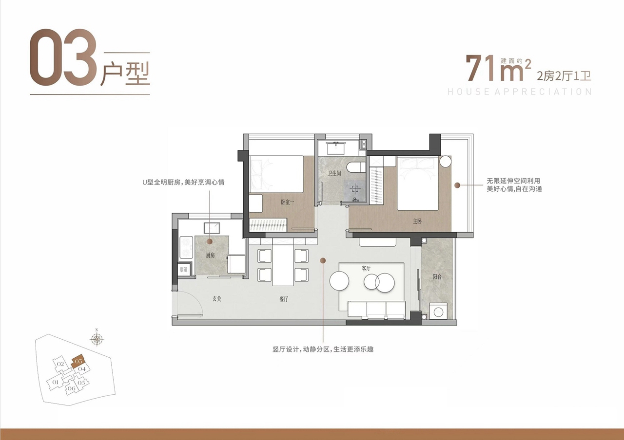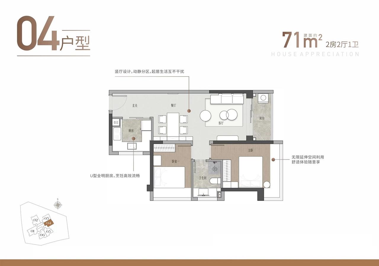 | 设计的是竖厅格局,客餐厅一体化设计,U型厨房,客厅阳台东北朝向。 | ||