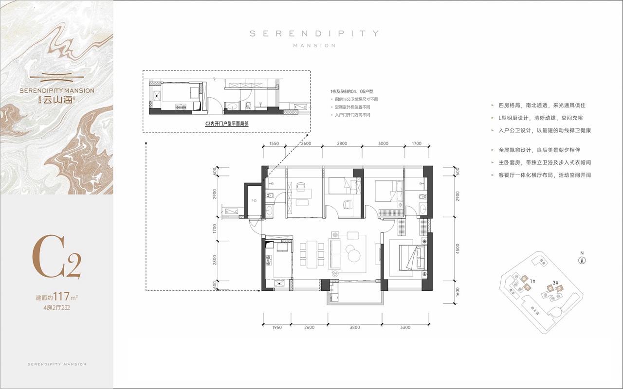 | 设计的是横厅格局,客餐厅5.4米开间,全屋飘窗设计,4个卧室分别为3.3米/3米/2.8米/2.6米的宽度,L型厨房,公卫三段式分离,得房率:76.86%(不含赠送),阳台主朝西南及东南朝向。 | ||