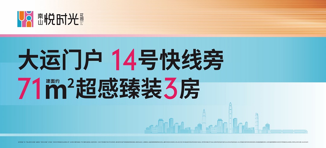 东部首条快线——14号线快线,时速达120公里,预计2022年9月底通车,南山悦时光毗邻嶂背站,1站大运,8站福田,30分钟直抵福田中心。