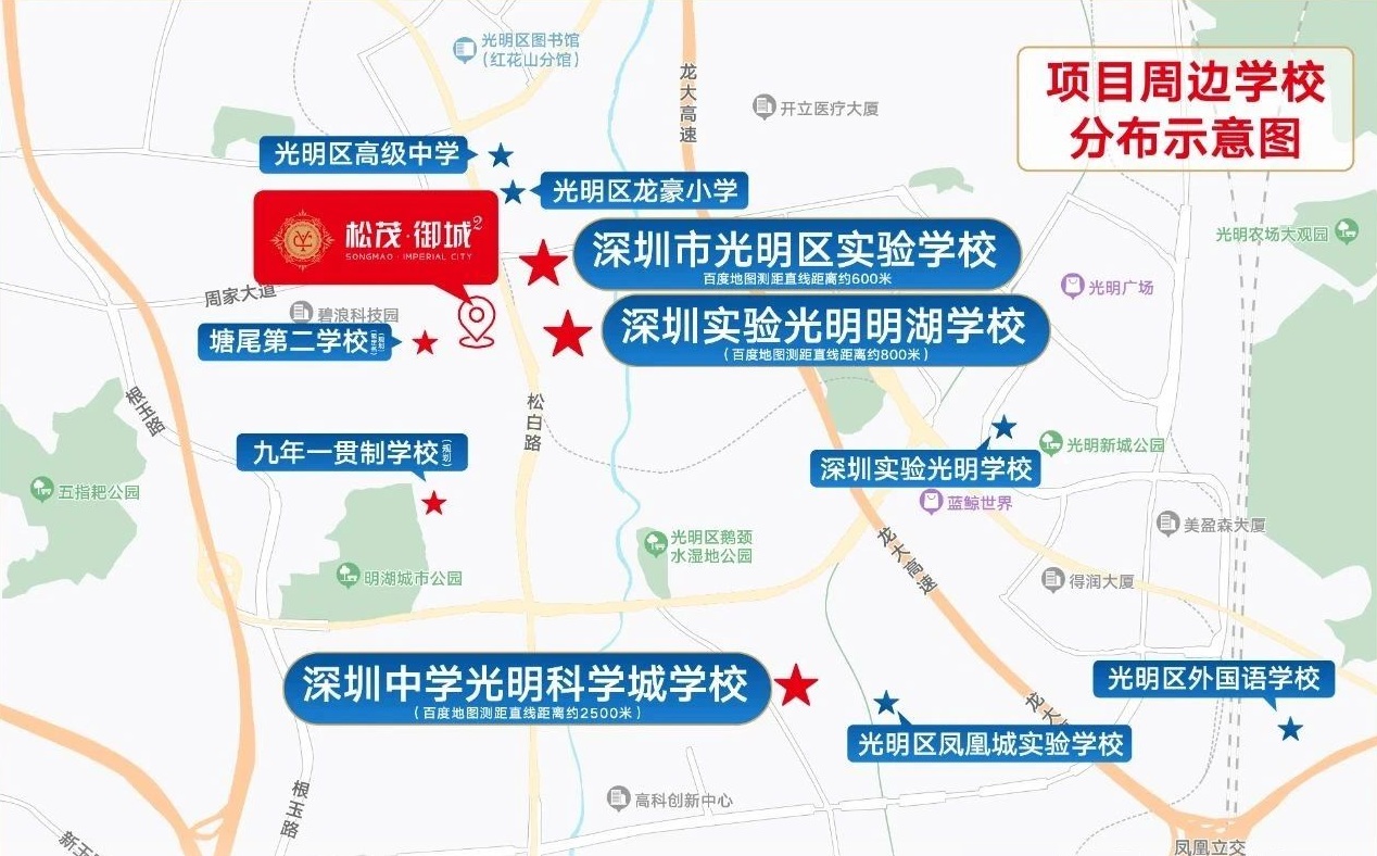 幼儿园:项目配建9班幼儿园; 初中:深圳实验光明学校、光明区高级中学; 九年一贯制学校:光明区外国语学校、光明区凤凰实验学校、光明区实验学校;TOD内规划3所学校; |