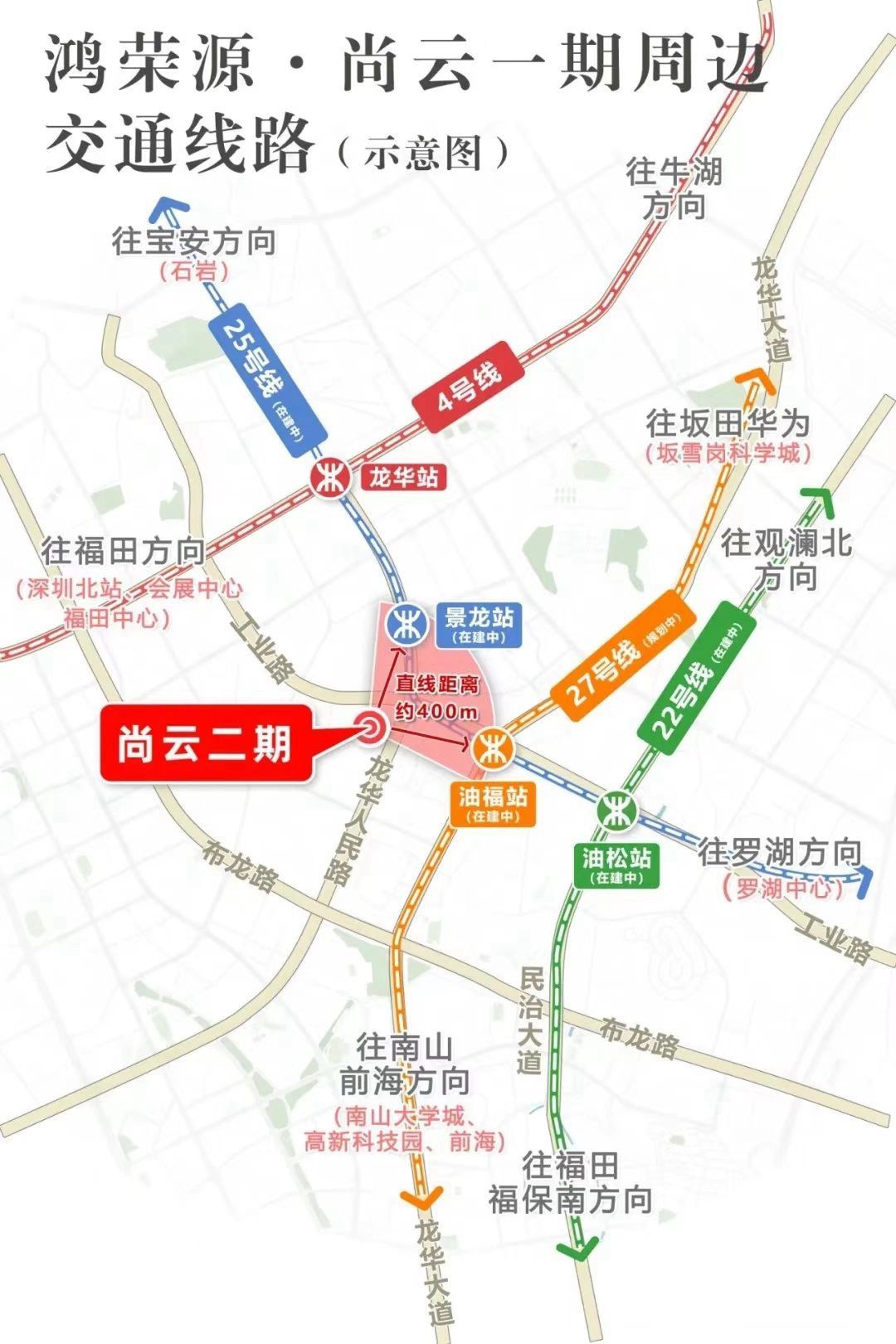 4号线(已开通):龙华站直线距离约1000m,深圳纵向城市交通中轴。 22号线(在建):油松站直线距离约1km,连接福田-龙华各大核心产业区。 25号线(在建):景龙/油福站直线距离约400m,打通城市东西走向核心动脉。 27号线(在建):油福站直线距离约400m,拥抱前海,覆盖各大高新人才聚集地。 |