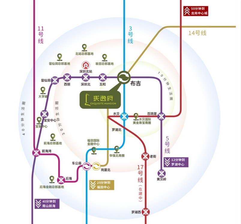 地铁3号线、5号线、14号线在此交汇,未来还将接入17号线和25号线,使得从布吉到福田CBD仅需3站地铁路程。 出门就是龙岗大道,还有机荷高速、水官高速、清平高速、南坪快速、龙岗大道和布龙路等多条高速公路和交通干道环伺,确保了该区域的交通便捷性。 |
