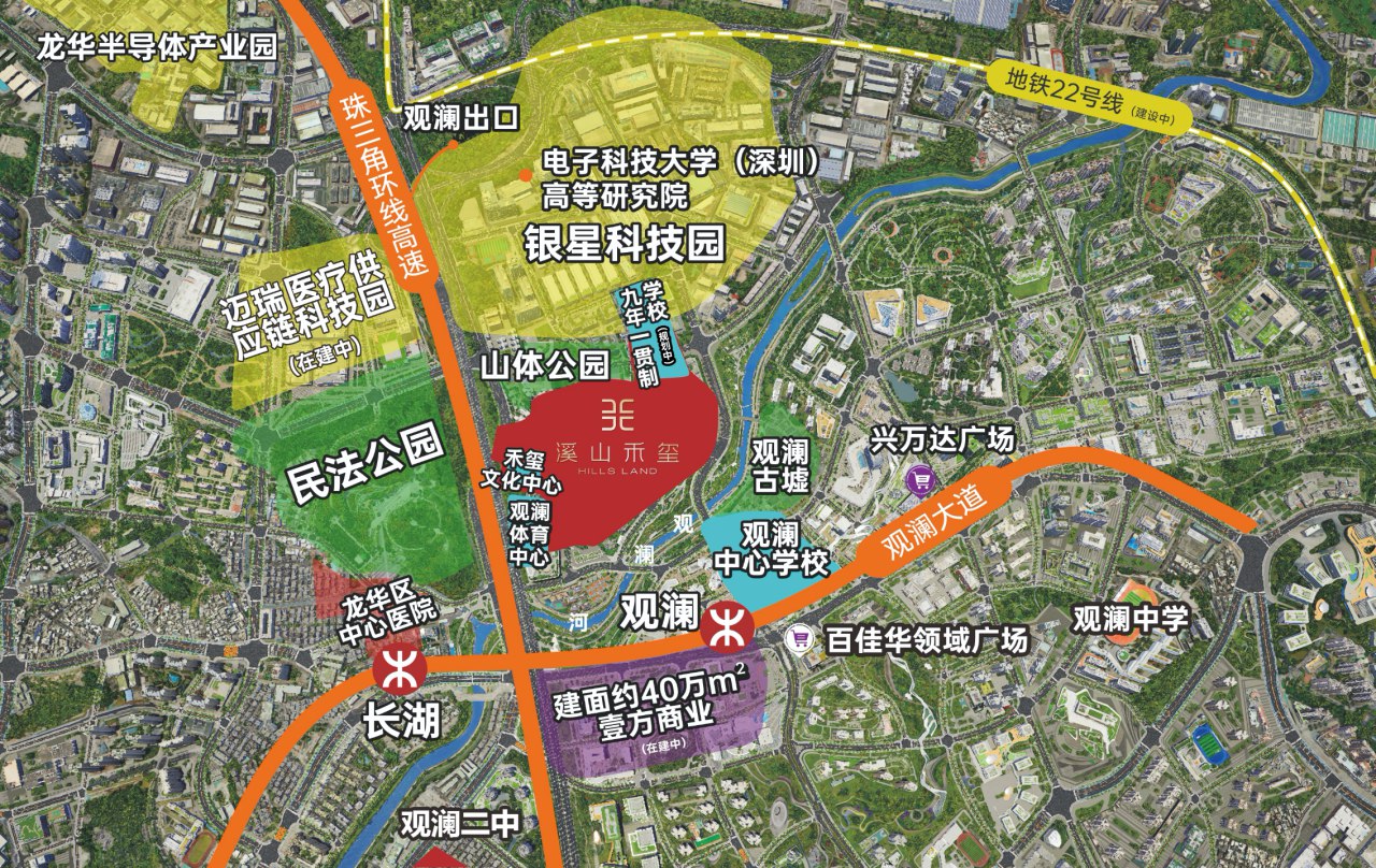 项目毗邻主干道观澜大道,周边还有珠三角环线高速,最近的4号地铁线“长湖站”距离约1公里,“观澜站”距离约1.3公里,8站到红山,9站到深圳北站,12站到福田上梅林。 |