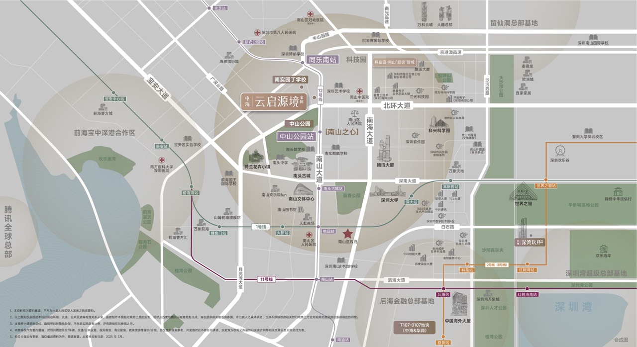 项目紧邻地铁12号线中山公园站(约700米步行距离)及同乐南站(约600米),可快速通达南山科技园、前海等核心商务区,同时15号线同乐关站(建设中,预计2025年建成)未来将形成双地铁覆盖,串联前海、后海、宝安等片区,进一步提升轨道交通便利性。 |