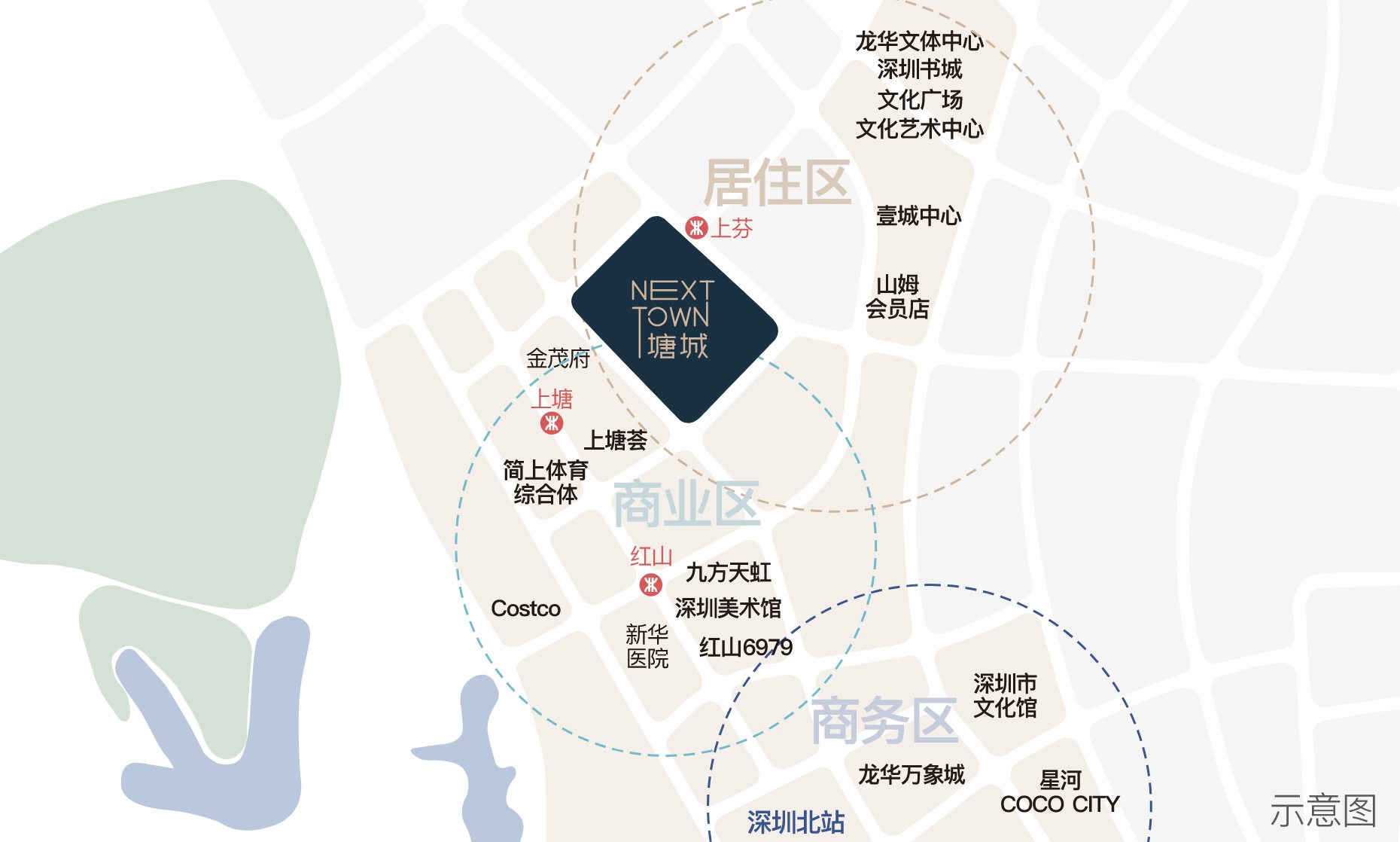 周边涵盖深圳美术馆新馆与深圳市第二图书馆两大深圳新十大文化地标;近享深圳文化馆新馆(在建中)、简上体育综合体、深圳书城(龙华城)等市级文体项目,打造10分钟文体服务圈,构建对标世界的艺术文化生活区。 |