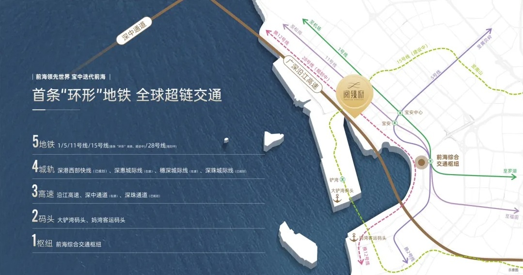 距离11号地铁线“宝安站”约800米,毗邻1/5/15号地铁线,还有28号地铁线(规划中)。 另外项目周边还有前海综合交通枢纽,大铲湾码头,妈湾客运码头,沿江高速,深中通道,珠海通道(已规划)等交通要道。 |