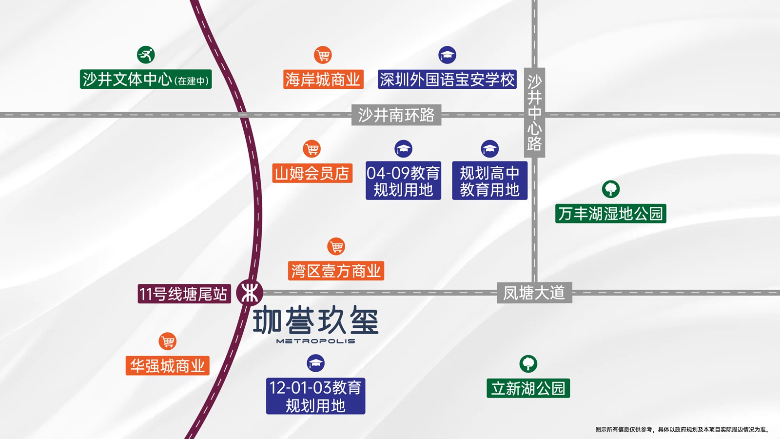 项目附近有深圳国际会展中心、海洋新城、海上田园等文旅设施。 项目距离凤凰山森林公园约3.5km,周边还有万丰湖湿地公园、立新湖公园等绿色休闲配套。 |
