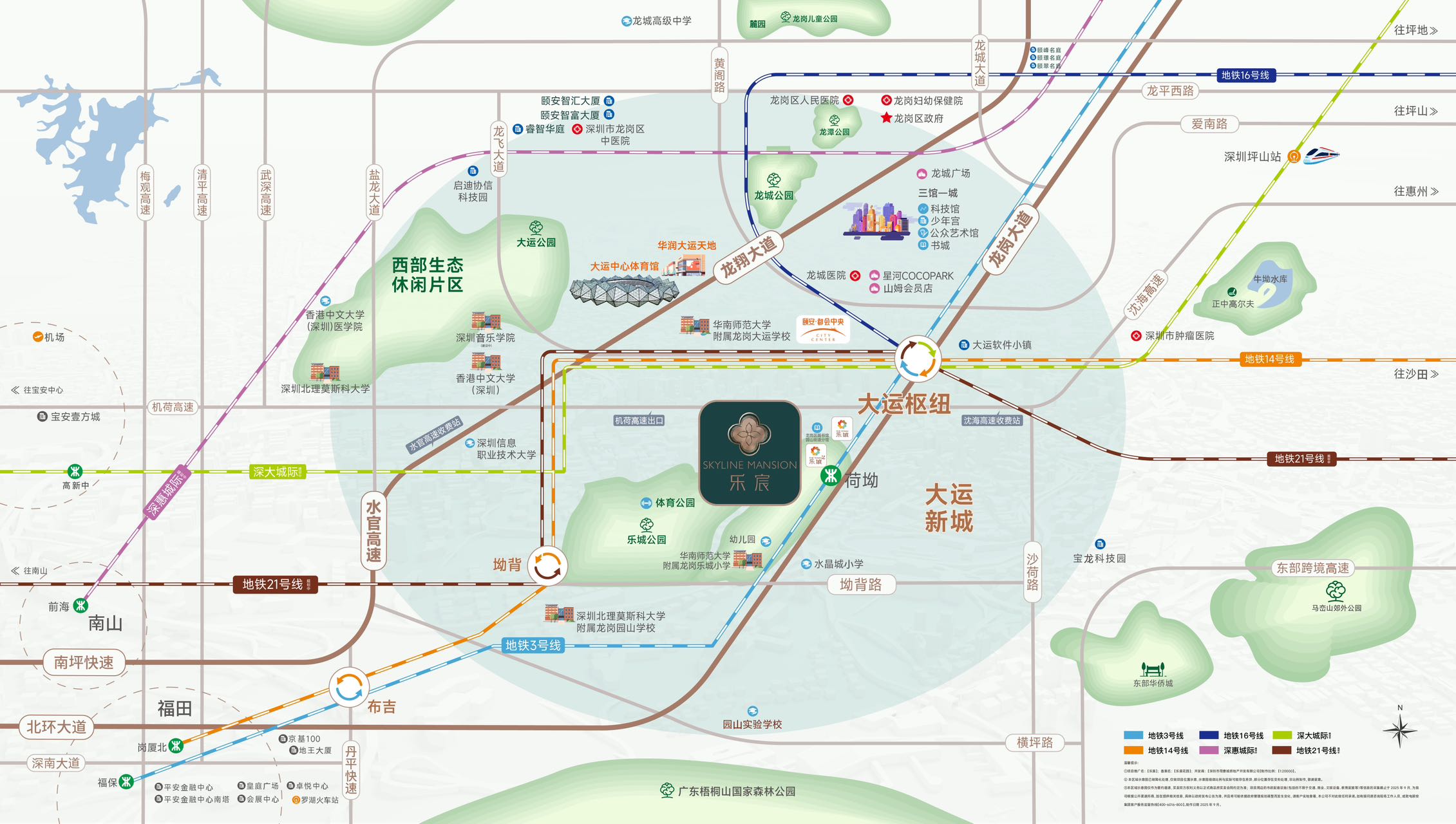 交通配套极为便捷,形成了地铁、公交、高速路网三位一体的立体交通体系。地铁方面,项目距离地铁3号线荷坳站约300米,步行5分钟即可抵达。乘坐地铁1站可达大运站,该站是深圳东部最大的综合交通枢纽,可换乘3号线、14号线、16号线等多条地铁线路。14号线已开通,16号线一期已开通,二期2025年底开通,深大城际(33号线)计划2027年开通,届时大运站将成为四线换乘枢纽。 |