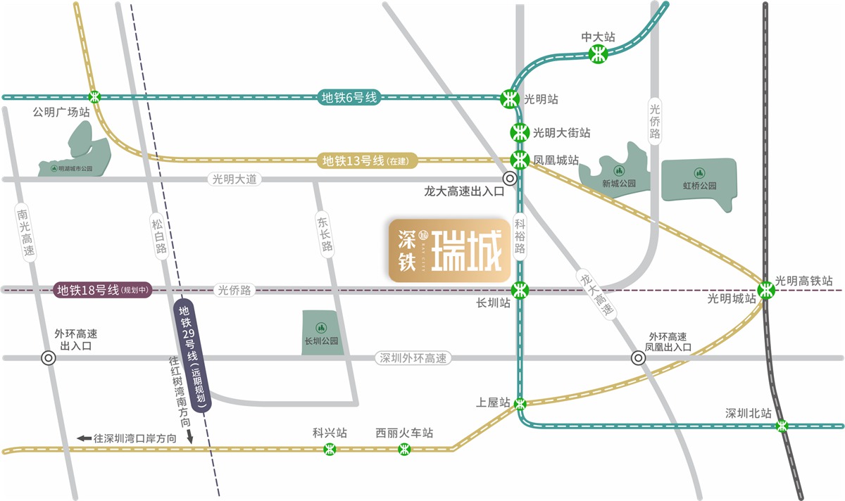 6号线长圳站,接驳18号线(规划中),快速切换13号线(在建中)速达南山科技园、后海等互联网、金融高地,29号线(规划中)直达福田、南山主城区。 近享龙大高速、南光高速、深外环等高速路网,执掌城市交通主动脉,畅联深圳各区繁华主场。 |