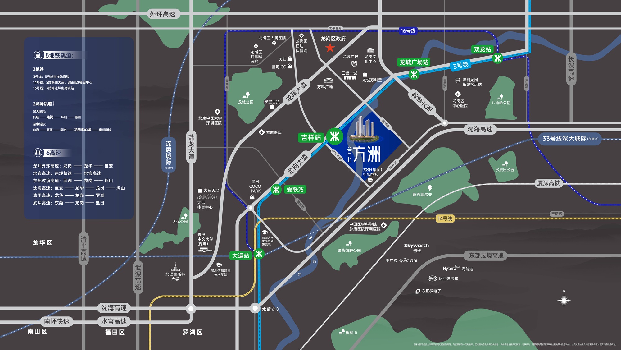 自驾10分钟接入水官高速、沈海高速,15分钟接外环高速,通过龙岗大道等主干道快速联通全市,目前已经开通运营的3号地铁线“吉祥站”距离约300米,2站到大运枢纽,可换乘14/16号地铁线,6站到罗湖,7站到福田,以及深大城际2站到五和,5站到石岩,4站到龙城公园站还可以换乘深惠城际线路,4站到深圳北站,5站到南山。 |