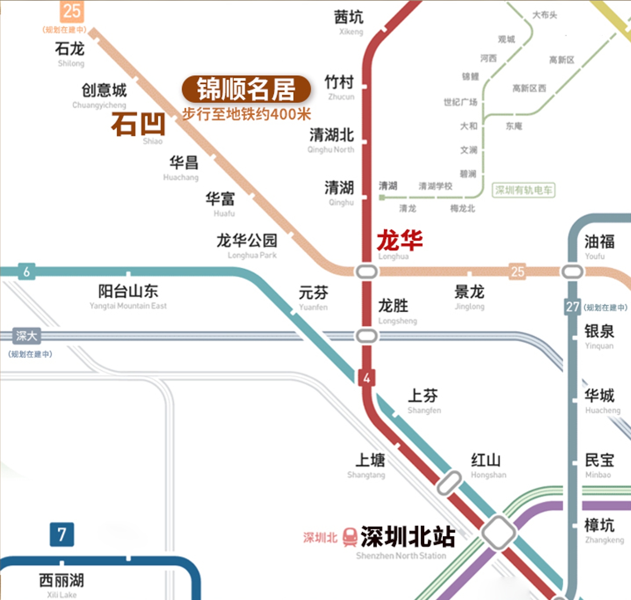 临近25号线石凹站,密切龙华大浪对外的交通联系。 重点工程(建设中):侨城东路北延,总投资112亿元,预计2026年通车,双向6车道,通勤提速15-20%,衔接福田&南山CBD等重点片区。 |